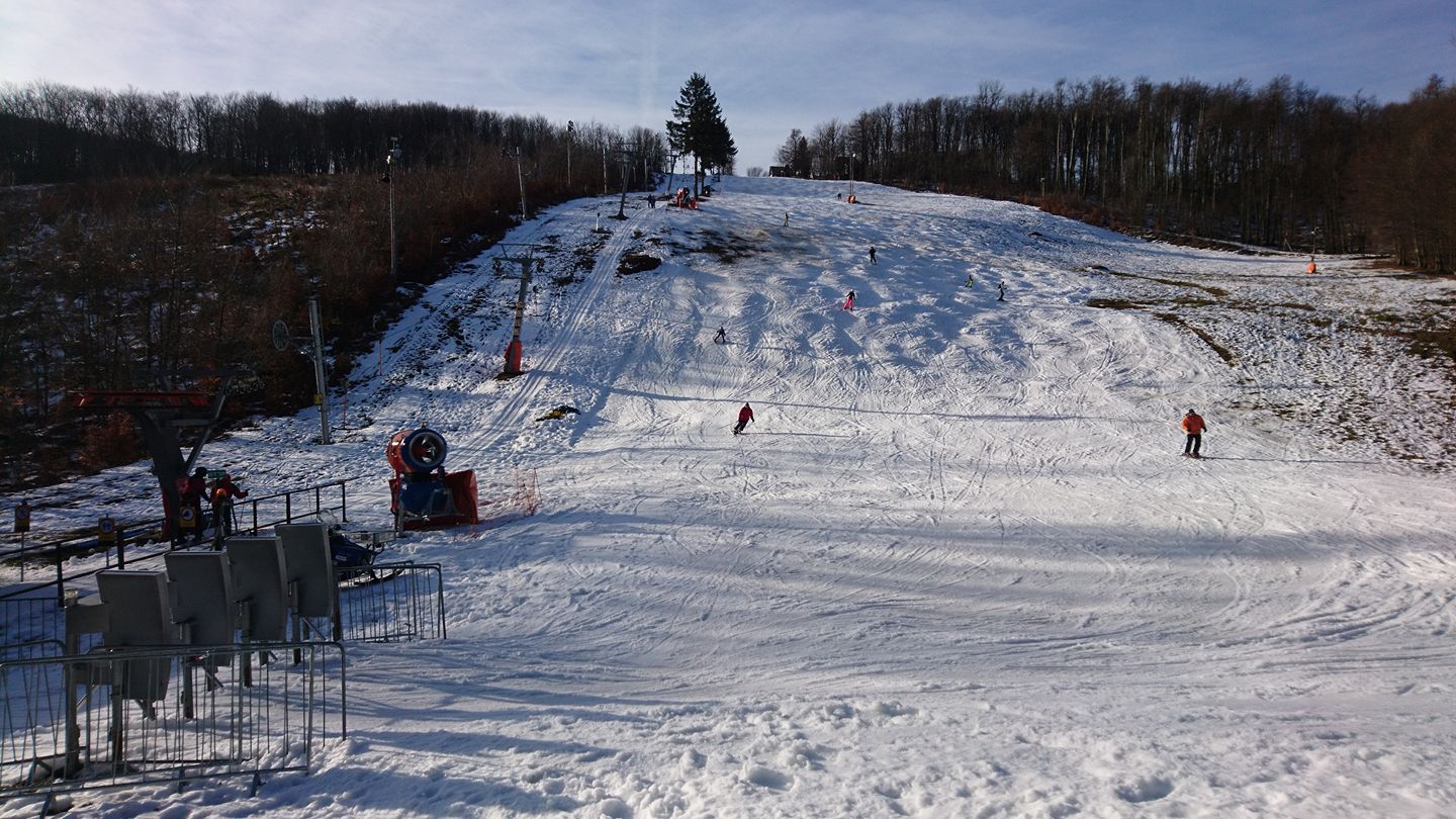 Pohľad na svah pri vleku DOUBLE 5.1.2018 o 10:30. Teplota a sneh ako na pravú poslednú jarnú lyžovačku.