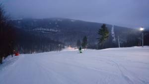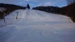Pohľad na svah pri vleku DOUBLE 3.2.2019 o 8:50. Vyšlo slnko a vyzerá to na krásnu „jarnú“ lyžovačku. Teplota 4,5°C, svah je mierne prituhnutý.