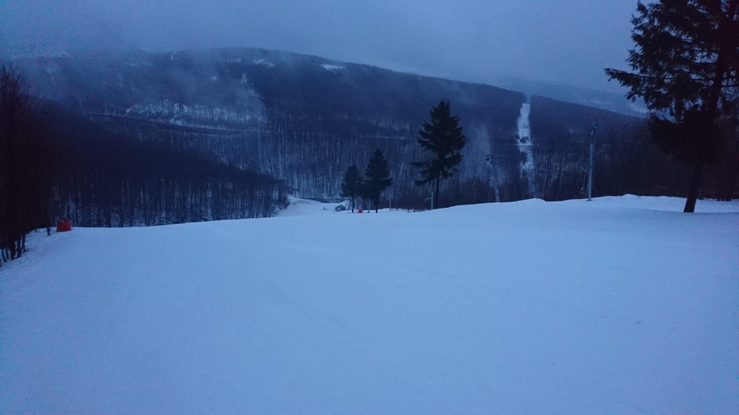 Pohľad na svah pri vleku DOUBLE 3.2.2019 o 8:50. Vyšlo slnko a vyzerá to na krásnu „jarnú“ lyžovačku. Teplota 4,5°C, svah je mierne prituhnutý.