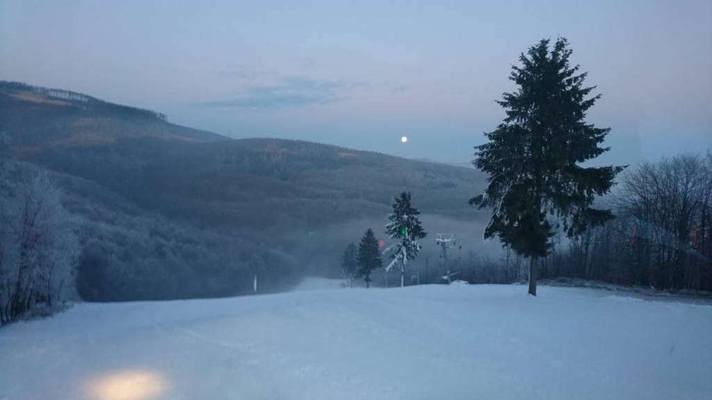 Pohľad na svah pri vleku DOUBLE 10.1.2020 pred večerným lyžovaním.