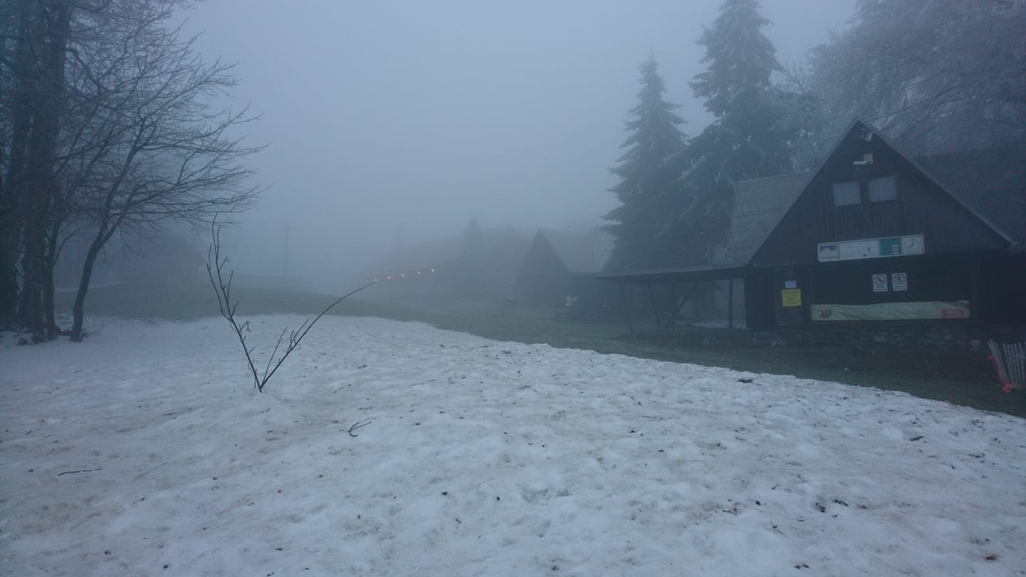 Obrázok z Pezinskej Baby 19.12.2020 o 8:00, teplota -0,8 °C, hmla, mrholenie. Pohľad na zvyšky technického snehu v hornej časti svahu pri vleku DOUBLE.