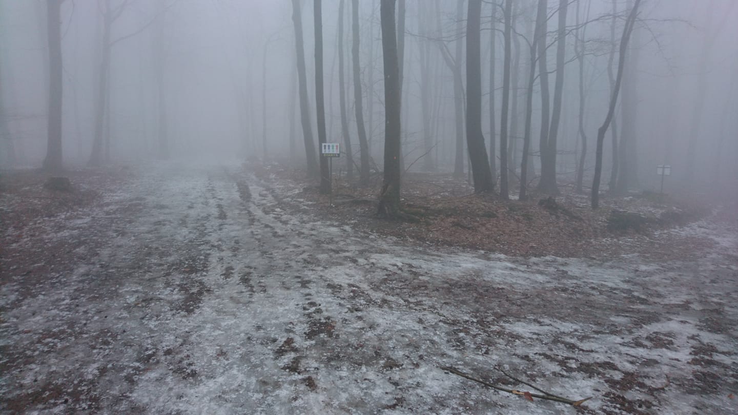 Aktuálne počasie na Pezinskej Babe 22.2.2021 o 7:50, teplota 0,2°C, oblačno, hmla. Po utlačenom snehu zostali väčšinou len ľadové plochy.