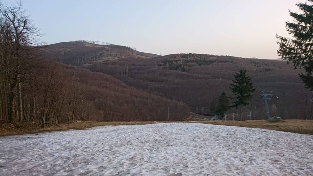 Aktuálne počasie na Pezinskej Babe 24.2.2021 o 7:10, teplota 12,6°C, takmer jasno. Extrémne vysoká teplota aj v noci. Aj z technického snehu zostali len zvyšky.