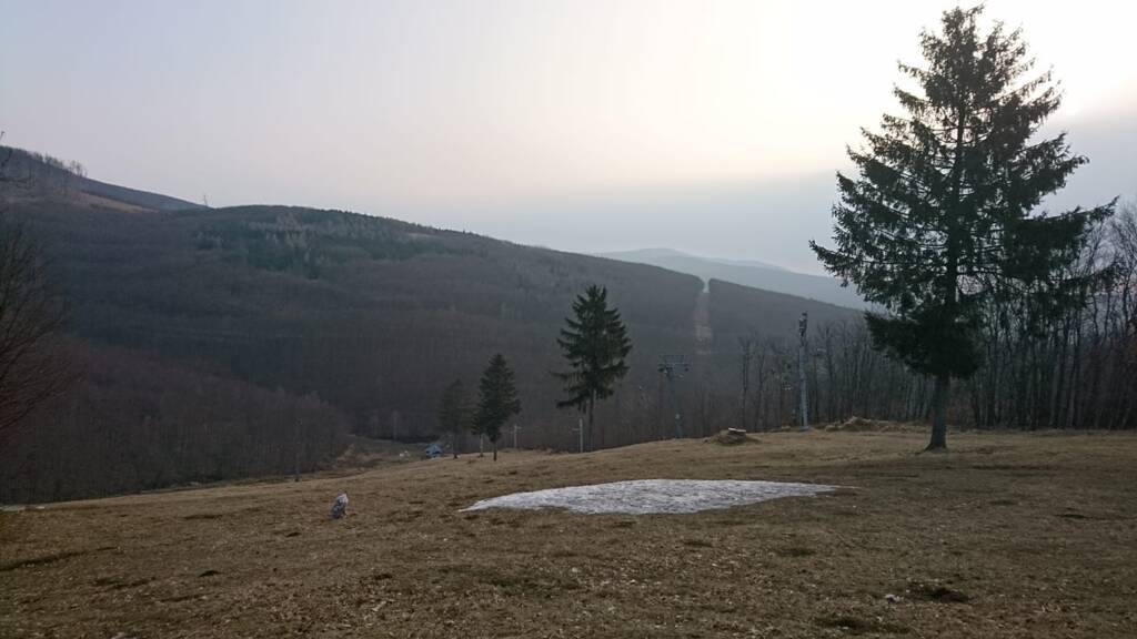 Aktuálne počasie na Pezinskej Babe 25.3.2021 o 7:00, teplota 2,4°C, polooblačno. Na svahoch sú ešte posledné zvyšky prírodného aj technického snehu.