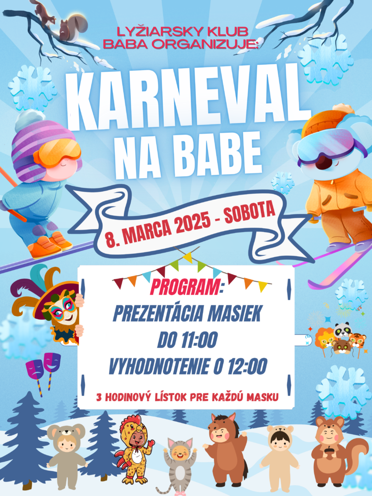 Keďže sneh stále máme v oboch strediskách, ale pomaly sa blíži koniec zimnej sezóny, tak v sobotu sa na Pezinskej Babe uskutoční karneval na lyžiach. Všetky masky dostanú trojhodinový lístok zdarma. V nedeľu si to zopakujeme v stredisku na Zochovej chate.