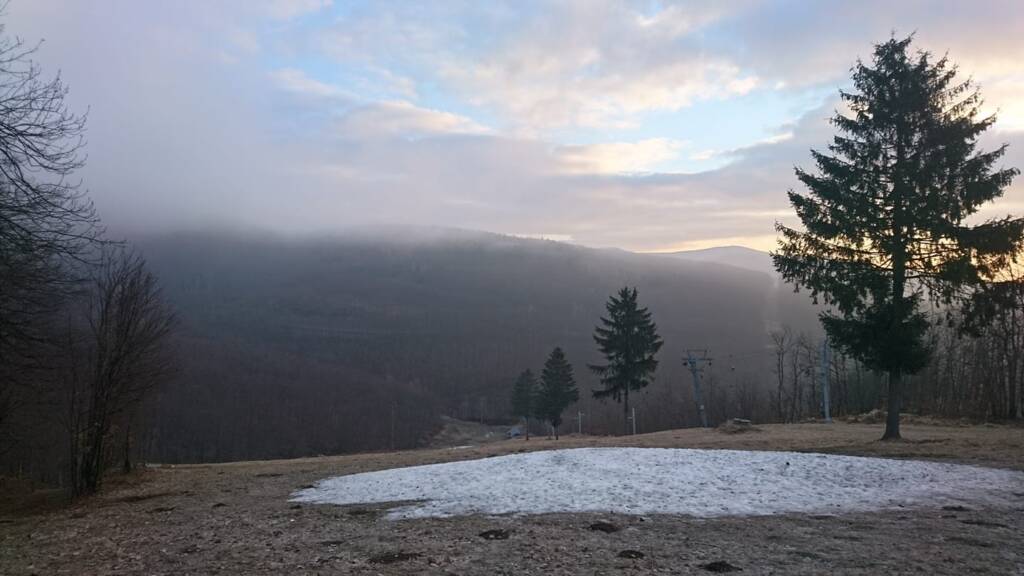 Current weather in Pezinská Babe 28.2.2021 O 7:00, temperature -0,7°C, cloudy, low fog. There are only remnants of technical snow. It was slightly frozen in the morning.
